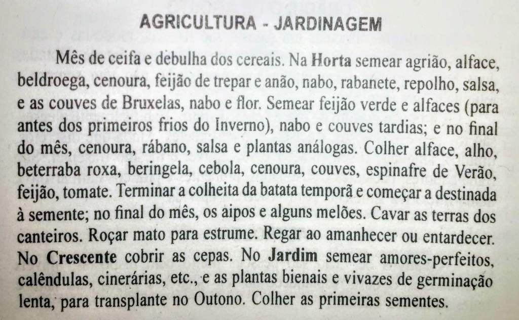 No crescente da Lua de Julho se costuma plantar nabos, cenouras, cebolas e mostarda. É muito bom cobrir as cepas, para que não as queime o Sol e cortar a grama da terra, a qual não torna a crescer como em outro tempo.